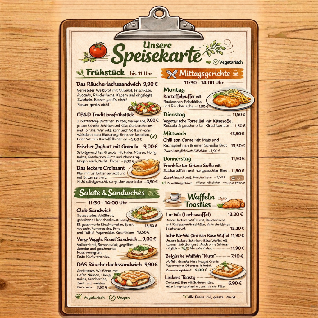 Da sich unsere Speisekarte regelmäßig ändert, lohnt sich regelmäßiges vorbeischauen.